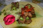 Muschiuletul se spala si se curata ,se impaneaza cu usturoi , se condimenteazasi se presara cu cimbrisor . Il ungeti cu putin ulei si il infasurati in folie transparenta. Lasati sa se odihneasca 2-3 ore minimum la frigider . Intr-o tigaie cu uleiul de masline caliti usor ardeiul taiat cubur[...