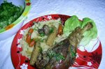 pulpele de curcan se spala bine si se incresteaza [ vezi imagine] . se curata usturoiul si morcovii . se feliaza baconul si rosia . din zeama de portocala , ulei, piper, boia, busuioc ,sare se prepara o mixtura cu care se maseaza pupele de curcan . se...