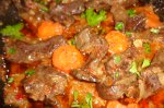 Sotati usor ceapa in ulei , presarati boiaua si amestecati totul cu bucatile de carne . Adugati vinul , condimentati cu sare , piper . Adugati cimbrul , cimbrisorul si busuiocul . Fierbeti sub capac pana cand carne este moale si se formeaza un sos usor legat...