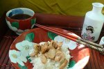 Se taie carnea in bucatele subtiri. Se pun bucatile de porc intr-un bol. Se rade ghimbirul si de adauga la carne,cu sosul de soia si sake (sau vin alb). Se lasa 10 minute,dar nu mai mult ca sa nu se intareasca feliile de porc.