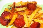 Se taie cartofii in felii si carnatul in rondele. Cartofii se pot taia si in rondele subtiri. Se adauga uleiul in tava,apoi cartofii. Se da la cuptor,cam 40 de minute sau pana cand s-au rumenit cartofii. Cu 5-10 minute inainte de a fi gata se adauga si rondelele de carnati.