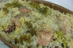 Se aseaza pulpele pe tava. Se adauga cana de orez si se acopera cu apa. Se pun bucatile de broccoli si se da la cuptor.