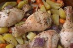 Se pun intai legumele taiate si apoi pulpele de pui la tava.