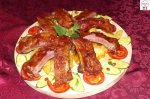 Se pune carnea intr-o marinada, peste noapte, dupa cum urmeaza: usturoi pisat, ½ de ceapa, boia dulce, ulei de masline, cimbru si vin alb sec, sare, piper. Se scoate a doua zi si se va unge cu un amestec format din: 3 lingurite de zahar brun, 1 lingurita sos de rodii...