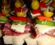 Eu am taiat painea sub forma de stelute (cu o forma speciala), am taiat branza topita, castravetele si ardeiul, apoi cu o scobitoare am prins salamul, branza topita, ardeiul, castravetele si maslina. Se fac foarte rapid, si sunt de efect.