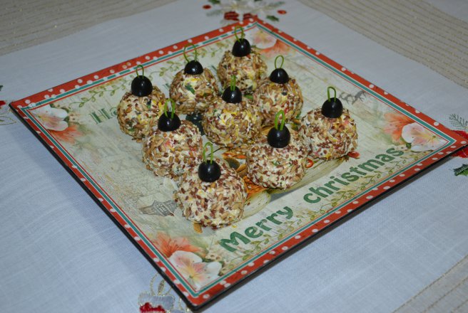 Le asezi pe un platou si le ornezi cu jumatate de maslina si o codita de patrunjel, pentru a arata ca un globulet.