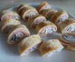 Până la urmă, m-am oprit asupra rulourilor de omletă, cu cașcaval și jambon, care pot fi servite atât calde, cât și reci, la mic dejun, sau la aperitive speciale. Și pentru ca descrierea să fie și mai clară, voi da aici link-ul inspirației mele, precizând că partea mea de "inovație" a fost miezul ruloului, dintr-o pastă din brânză de vaci și măsline.