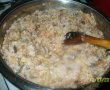 Se toaca ceapa(3 cepe) sau se rade la fel si morcovul, dupa care se caleste pe foc, ciupercile se spala se taie si ele marunt si se calesc impreuna cu cepa, morcovul, dupa ce sunt calite se adauga in carne unde se adauga si orezul care a fost in prealabil spalat, se sareaza si pipereaza se adauga aproximativ 200 ml de pasta de tomate, se amesteca, dupa care se mai pun pe foc 10 minute.