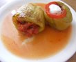 Umplem ardeii cu compozitia de carne si ii asezam intr-un vas uns cu ulei(pentru ca nu stateau prea bine i-am sprijinit cu ajutorul unor felii de cartofi ).Punem deasupra fiecarui ardei cate o feliuta de rosie.Amestecam intr-un bol restul de pasta de tomate si apa si apoi o turnam printre ardei.Dam la cuptor la foc potrivit pentru o ora si 15-20min.Se servesc calzi,cu smantana.