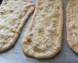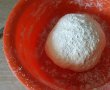 Se toarna peste faina din bol, se pune si uleiul si restul de apa calduta cate putin in timp ce se amesteca. Dupa ce s-a incorporat faina, se rastoarna pe masa de lucru infainata si se framnata pana se obtine un aluat moale dar nelipicios. Se lasa sa dospeasca pana isi dubleaza volumul.