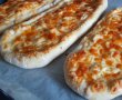 Aluatul se imparte in 6 parti egale. Se ia fiecare bucata si se intinde in forma ovala. Marginea se indoaie de jur imprejur formand o bordura. Se asaza in tava tapetata cu hartie de copt si se umple fiecare barcuta cu topping. Deasupra se presara mozzarela data pe razatoarea cu gauri mici.