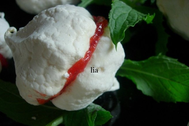 Punem tavile in cuptor ( eu le-am pus pe amandoua odata, vezi foto), dam focul la mic si cu usa cuptorului intre-deschisa, coacem bezelele timp de 2h, apoi stingem flacara si le lasam in continuare, in cuptor, pana se racesc de tot (eu le-am lasat de seara pana a doua zi dimineata). Si pentru ca gemul de capsuni era si el gata fiert, am rupt vre-o doua crengute de menta, si am inceput sa asamblez bezelele. Intindem putin gem pe o bezea, punem o frunzulita de menta (pe care am umezit-o in gem) si lipim cu alta bezea.