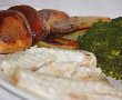 Pestele si cartofii s-au rumenit frumos, in timp ce buchetelele de broccoli sunt de un verde intens si usor crocante. Fiind gatite la abur, atat pestele cat si legumele si-au pastrat fiecare gustul propriu.