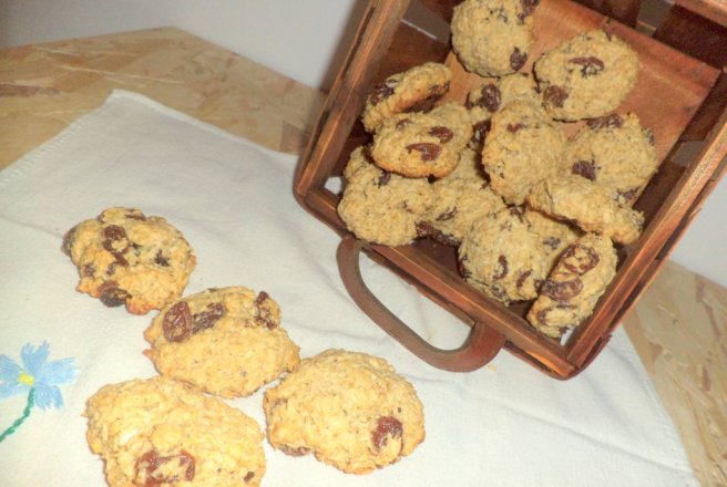 In untul topit la microunde, am adaugat cele 3 linguri de zahar brun. Am amestecat bine pana ce zaharul s-a topit, apoi am pus fulgii de ovaz, oul batut si esenta de vanilie. Am amestecat bine, apoi am pus scortisoara, faina, stafidele, praful de copt si nuca de cocos. Cu mana umezita am format bilute, pe care le-am aplatizat si le-am pus intr-o tava tapetata cu hartie de copt.