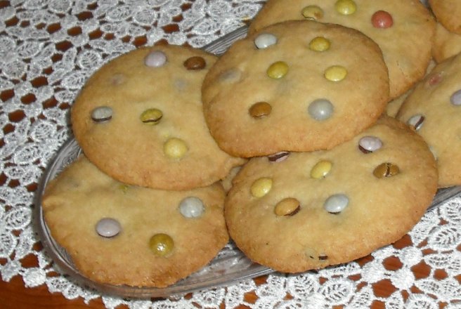 Amestecam faina,vanilina,praful de sare si zaharul apoi adaugam untul cubulete si amestecam cu mainile pana rezulta un aluat compact dupa care adaugam bombonelele.