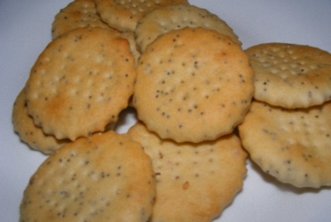 La final se adauga macul/susanul si se framanta pana obtineti un aluat lucios si nelipicios (cca 5 minute). Se lasa aluatul la crescut 1 ora, apoi se intinde o foaie subtire din care decupam biscuitii (pe care ii puteti presara cu putina sare fina, daca ii vreti mai sarati). Se tapeteaza o tava cu hartie de copt si se asaza biscuitii la distanta destul de mica (nu cresc prea mult). Se incalzeste cuptorul la 175 grade C si se da tava la cuptor pana incep sa devina biscuitii aurii.
