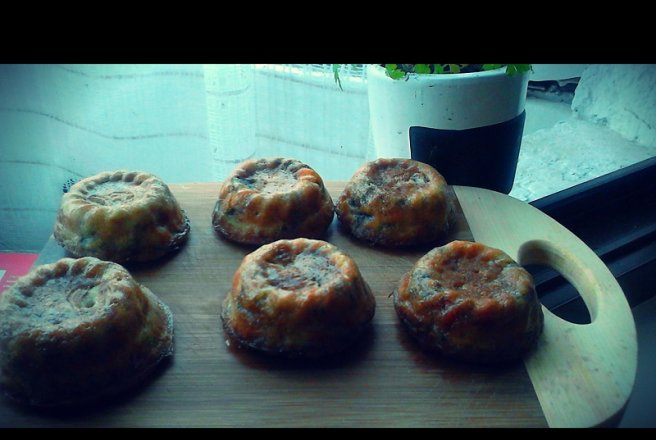Se amesteca faina, ouale, praful de copt, sarea si piperul pana capata o consistenta de chec, se adauga restul ingredientelor spalate, curatate si taiate marunt in prealabil. Amestecam toate ingredientele usor pana la omogenizare, se pune cate o lingura mare de amestec intr-o forma de briosa unsa cu ulei sau unt si se dau la cuptor la foc mediu,pentru 30-35 de minute.