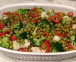 Punem o oala cu apa pe foc, iar cand incepe sa fiarba se adauga buchetelele de conopida si broccoli la oparit. Se lasa 5-10 minute, se scot si se pun intr-un vas termorezistent sau de ceramica.