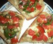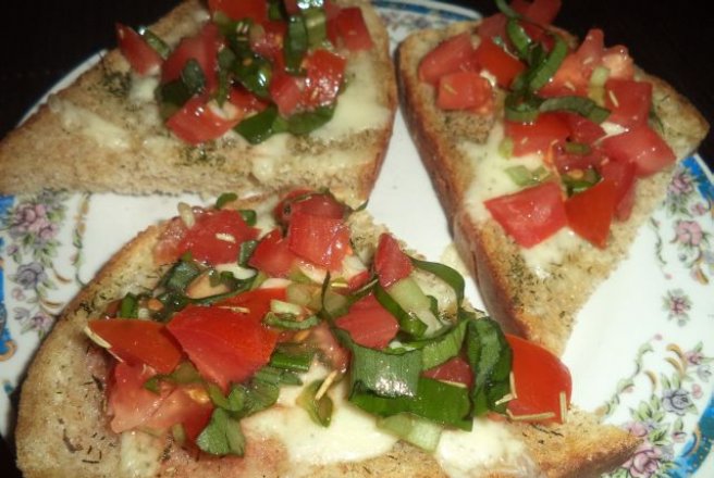 Le scoatem fierbinti din cuptor,adaugam cubulete de rosii si fasii de leurda pe bruschete,daca dorim mai presaram si rozmarim uscat si apoi servim.