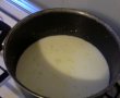 Punem laptele pe foc cu zahar si coaja de lămâie rasă. Lasam sa fiarbă. Adaugam grisul in ploaie amestecand cu un tel.Lasati sa se răcească putin. Dupa aceea adaugam untul si ouale batute bine, amestecand ușor.
