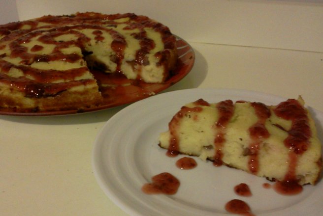 Adaugam si prunele taiate cubulete, puse putin la scurs inainte . Amestecam bine. Punem compozitia intr-o tava ( 36 cm diametru ) unsa cu ulei și dam la cuptor la 180° timp de 30 de minute pana devine aurie. Lasati sa se raceasca.Eu am ornat cu putina dulceata de prune.