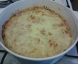 Se unge vasul cu ulei, se toarna compozitia si se niveleaza. Se da la cuptorul incins in prealabil, la foc mic, cam 45 min. Se scoate din cuptor, se presara deasupra cascavalul dat pe razatoarea mare si se mai da la cuptor 10 min.