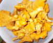 Adaugam putina sare si piper, ciupercile vor elibera continutul de apa pe care il contin, lasam la foc pana scade toata aceasta apa si incep galbiorii sa se rumeneasca.
