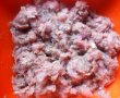 Am spalat bine carnea,am tocat-o prin masina de carne,o parte prin sita mare si o parte prin sita mai mica,am tocat si ciupercile,ghimbirul si usturoiul,apoi am impartit carnea in 2 parti relativ egale,intr-o parte am adaugat seminte de fenicul prajite si maruntite bine la mojar,sare si piper si in cealalta parte am adaugat paprika iute afumata,chimen macinat, sare si piper..