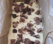 Tapetam tava cu hartie de copt si turnam 1/2 din compozitie. Deasupra punem bucatelele de ciocolata.