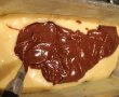 Ungem cu margarina forma de chec, apoi o tapetam cu faina si turnam compozitiile, alternand cea de ciocolata cu cea de alune.