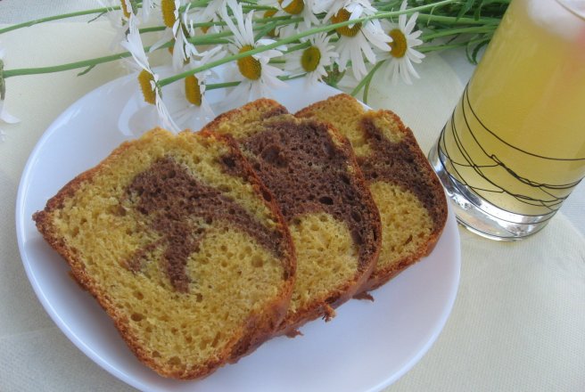 Punem si faina si praful de copt , iar cand sunt incorporate bine turnam ¾ din aluat in tava deja pregatita . In restul de aluat ramas adaugam o lingura de cacao , amestecam si punem peste aluatul din tava .