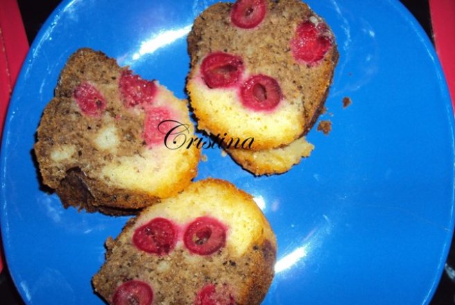 Aluatul se imparte in doua.Intr-o parte aluatul se amesteca cu gemul, cacao si 20 g faina.Turnam o parte din aluat intr-o tava rotunda, tapetata cu hartie de copt, apoi se aseaza fructele date prin 20 g faina.Se toarna cealalta jumatate de aluat ( cel cu cacao).Se coace cam 50-60 minute sau pana este gata.Se orneaza cu zahar pudra.