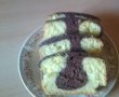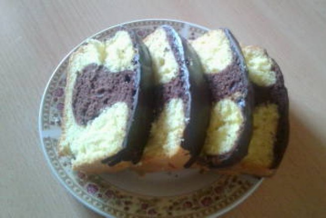 Intre timp incalzesti cuptorul la 180 de grade Celsius si pui hartie de copt intr-o tava mare de chec. Pui jumatate din compozitie in tava iar in cealalta adaugi cacao amesteci bine si pui peste compozitia alba. Dai checul la cuptor pentru 35-40 minute. Nu deschide cuptorul in primele 15-20 minute. Scoti checul din cuptor lasi sa se raceasca si glazurezi.