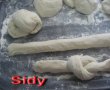 Se introduc ingredientele in masina de paine in ordinea enumerata si se planifica masina la programul de framantat si dospit. Cand este gata programul, scoatem aluatul pe o suprafata facuta cu faina. Impartim coca in 6 parti egale apoi modelam aluatul in bare lungi de aproximativ 30 cm.Innodam bara iar capetele le dam dedesubt, cum se vede in poze.