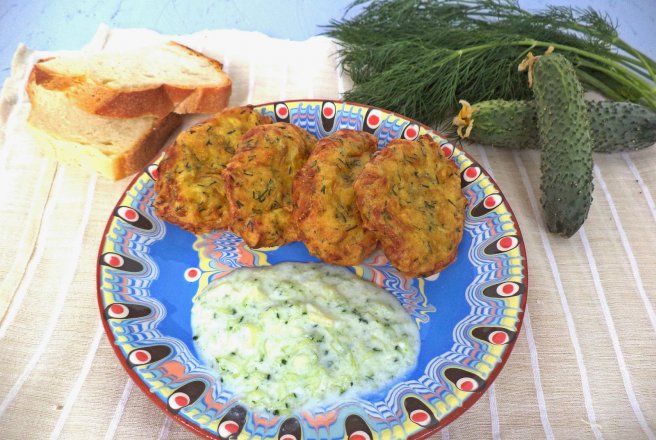 Dovleceii i-am curatat de coaja, i-am ras prin razatoarea cu ochiuri mari, apoi am presarat putina sare si am lasat putin sa-si lase zeama. Dupa cca 20 minute, am strans in palme razatura de dovleac si am eliminat toata zeama. Am amestecat dovleacul cu oul batut, patrunjelul, piperul, cateii de usturoi pisati, iar la final faina. A rezultat o compozitie legata dar moale. Intr-o tigaie am pus ulei, iar cu ajutorul unei linguri (udate inainte) si cu palmele umede, am format chiftelutele pe care le-am prajit cateva minute pe ambele parti. Le-am scos pe un servet de hartie pentru a-si absorbi uleiul in exces. Am servit chitelutele calde, alaturi de un sos facut din usturoi, castravete ras si iaurt slab.