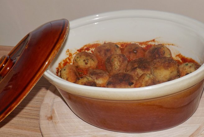 Intr-un vas termorezistent se pune sosul de rosii, se adauga chiftelele, se acopera vasul si se da la cuptorul incins la 180 grade pentru 20 minute. Se servesc cu garnitura preferata, noi am servit cu piure de cartofi. Sa va fie de bine!!