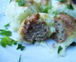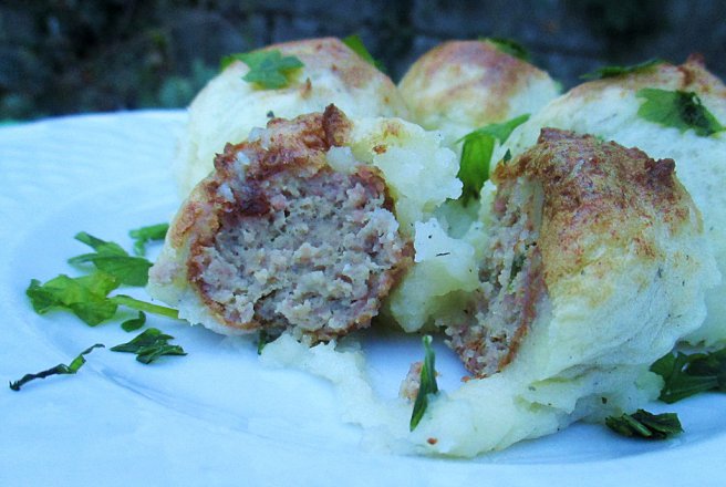 Luam o chifteluta si o '' imbracam'' in piure de cartofi. Procedam astfel cu restul de chiftelute.