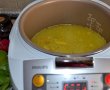 Când uleiul s-a încins, se adaugă ceapa tocată mărunt şi morcovii raşi pe răzătoarea cu ochiuri mari. După ce s-au călit, se adaugă orezul, se amestecă împreună câteva minute, apoi se adaugă apă ( sau supă de legume) şi se lasă să fiarbă bine, selectând programul BOIL.