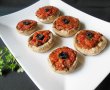Intr-o tava tapetata cu hartie de copt punem ciupercile si le umplem cu compozitia obtinuta mai sus. Deasupra lor asezam rondele de masline.