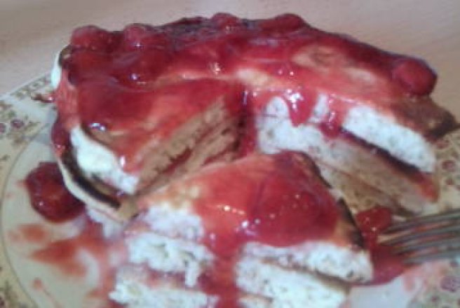 Ungem cu ulei o tigaie din teflon.Punem in mijloc cate un polonic din compozitie.nu miscam tigaia pentru ca se intinde singur atat cat trebuie.Cand se formeaza gauri deasupra ,intoarcem pe cealalta parte.Servim cu dulceata.