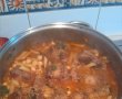 In cratita tocam ceapa si il punem la calit cu putin ulei de masline si apoi adaugam 2 cateu de usturoi tocati marunt. Mai lasam 2 minute si aduagam morcovul si ardeiul taiate cubulete mici . Dupa ce se mai calesc vreo 5 minute la foc domol adaugam carnea in oala. O prajim pe toate partile si apoi turnam vinul alb. Lasam sa fiarba, sa scada vinul si apoi incepem sa condimentam cu sare, piper, pasta de ardei rosu, pasta de rosii, boia, dafin, si un chilli. Apoi stingerm totul cu apa fierbinte inc are am dizolvat un concentrat de supa (sau daca avem supa facuta punem supa. Lasma sa fiarba cca 2 ore, acoperit cu capac,pana carnea devine frageda si se desprinde usor de pe os. Daca nu aveti timp puteti folosi oala cu presiune.