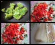 Ciupercile, ceapa si ardeiul se curata si se taie, apoi se pun in tigaie la calit cu putin ulei de masline. Se adauga si brocoli si se lasa la calit pentru aproximativ 5 minute.
