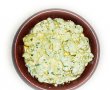 Intr-un bol punem ouale, iaurtul, 3 linguri de cascaval, catei de usturoi pisati, sare, un praf de piper, patrunjelul verde tocat fin si coditele de ceapa verde taiate marunt. Omogenizam.