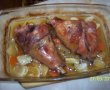 Se toarna in vas vinul si supa de pui. Se acopera cu folie de aluminiu si se da la cuptor pt cca o ora. Se scoate din cuptor, se indeparteaza folia si se pune ceapa. Se da din nou la cuptor pt inca 30-40 minute sa se rumeneasca frumos.