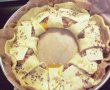 Aluatul dopsit se scoate din vas se întinde în formă rotundă, apoi se pune într-o tavă tapetată cu foaie de pergament, se pune de jur împrejur pe margini umplutura de mai sus, lăsând mijlocul liber. Din mijloc se trasează felii cu un cuțit bine ascuțit, apoi aceste felii triunghiulare se ridică peste umplutura cu carne, ce în prealabil a fost acoperită cu felii de cașcaval. Imaginile sunt concludente, sper ;)