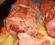 Intr-un vas termorezistent le asezam toate si desupra asezam bucatile de cotlet condimentate cu sare, piper si boia.