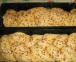 Asezam si cel de-al doilea cozonac in tava unsa cu ulei, il ungem cu galbenus si presaram seminte de in si sare grunjoasa.