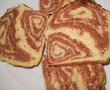 Se ia alta bucata, intindem, adaugam crema si rulam. Cele 2 rulouri le rulam impreuna si asezam in tava unsa bine cu ulei, mai lasam 20 minute, dupa care ungem cu galbenusul amestecat cu putin lapte. Am adaugat deasupra ciocolata ornament. Dam la cuptor incalzit pana se rumenste, lasam sa se raceasca putin in tava.