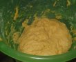 Intr-un bol diluam drojdia cu o lingura zahar si putin lapte. Intr-un castron punem faina si untul pe care l-am tinut la temperatura camerei. Adaugam drojdia, ouale batute cu zaharul, vanilia, un pic de sare si laptele. Amestecam bine, framantam un pic si lasam la crescut intr-un loc cald cam 30 minute, pana dubleaza volumul.