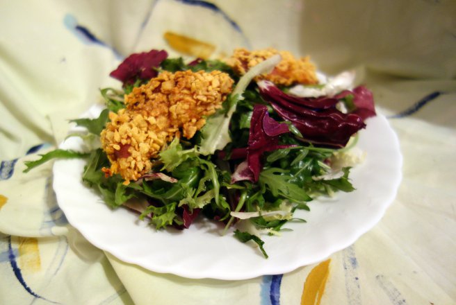 Pieptul de pui il feliezi transversal in portii groase de 1,5-2 cm. Presari putina sare. Amesteci iaurtul cu oregano si boia. Zdrobesti fulgii de porumb cat mai marunt. Eu i-am pus intr-o punga si am dat cu sucitorul peste ei. Tavalesti pieptul prin iaurtul condimentat si apoi prin fulgi, dupa care il asezi pe hartie de copt, intr-o tava. Dai tava la cuptorul preincalzit la 170* C pentru 20 de minute. Intre timp iti prepari salata. Eu am rupt cu mana frunzele, am turnat zeama de lamaie si am dat puff-urile de ulei, apoi am amestecat bine totul.